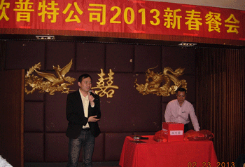 2013年2月23日,我公司员工齐聚一堂,举行2013年新春聚餐活动。活动中公司领导对欧普特新的一年寄予致辞并对荣获2012年“杰出员工”荣誉称号的员工颁奖,伴随着紧张刺激的游戏和激动人心的抽奖,此次聚餐活动在大家的欢声笑语中圆满落幕,但是我们欧普特的未来正在扬帆起航,也希望在2013年里大家都能为自己的梦想而奋斗!